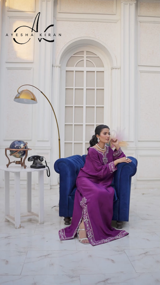 A timeless pure silk kaftan crafted for effortless elegance. Adorned with exquisite embroidery along the neckline, sleeves, and side slits, each detail is elevated with delicate hand-worked pearls. The fluid silhouette drapes beautifully, offering comfort and grace in a one-size-fits-all design—perfect for festive evenings and special occasions.