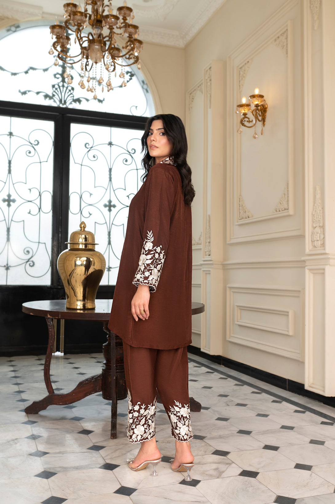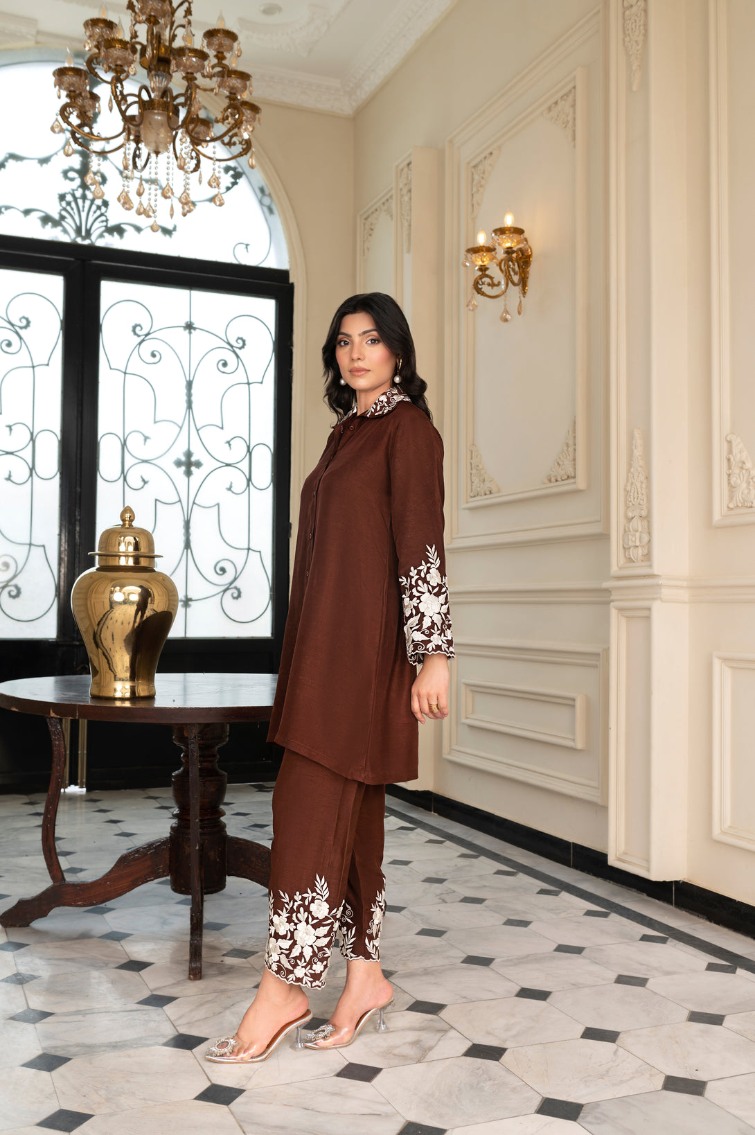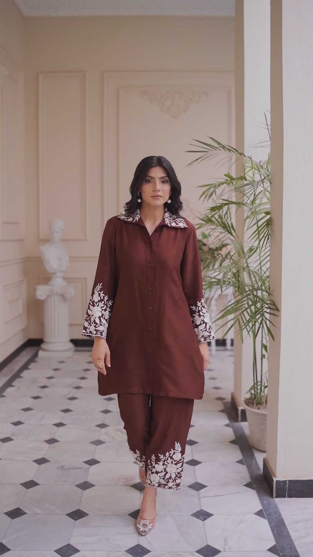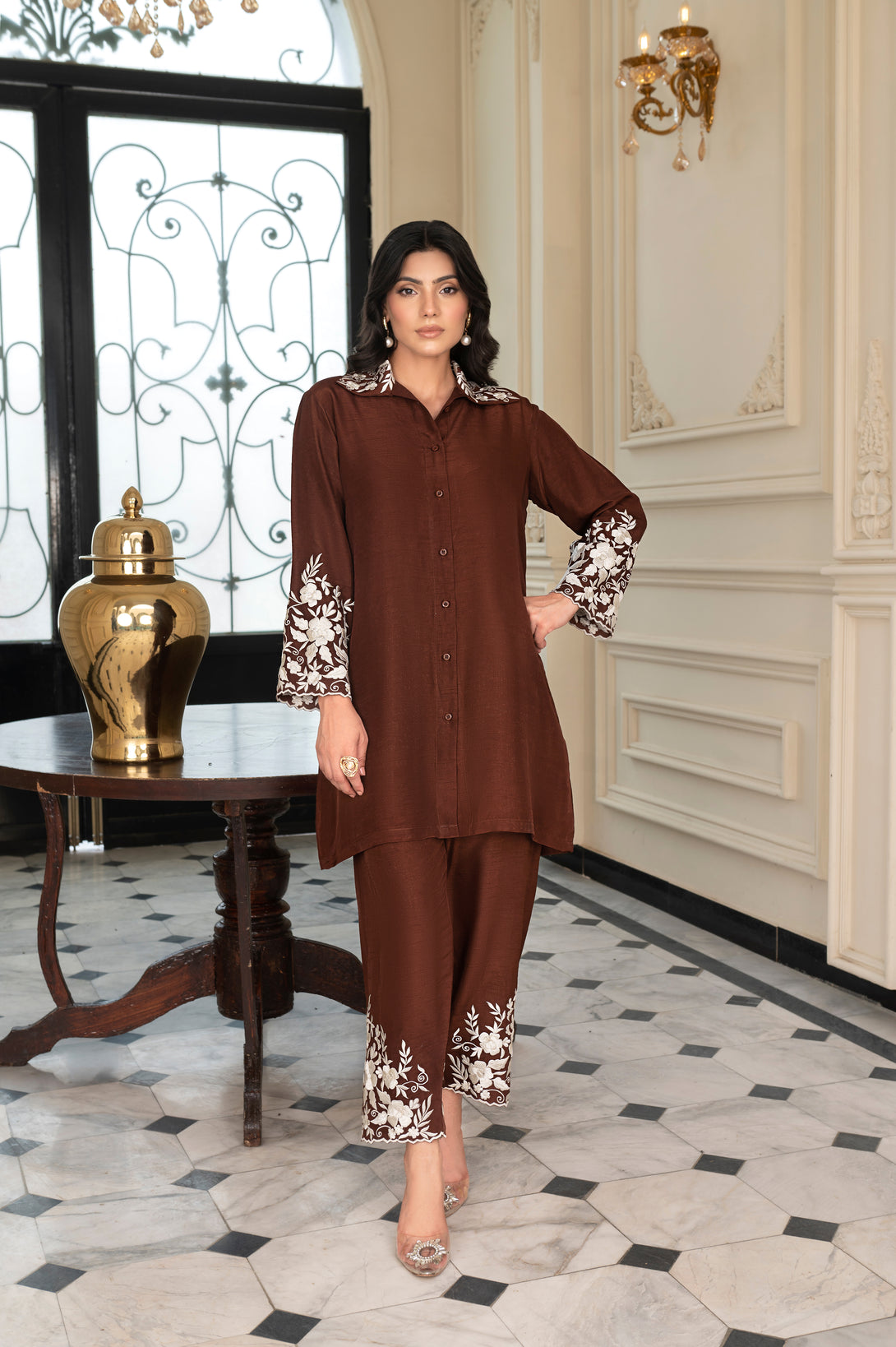It is paired with straight raw silk pants, finished with matching ivory embroidery, creating a harmonious and polished look. The simplicity of the design highlights its versatility, making it a graceful choice for both formal gatherings and semi-formal occasions.