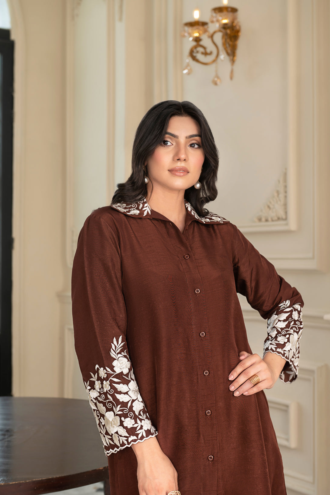 Minimalism meets timeless charm. Ayra is a refined raw silk ensemble that embodies subtle sophistication. The shirt is elegantly detailed with ivory embroidery on the sleeves and collar, giving a delicate yet graceful touch to the design.