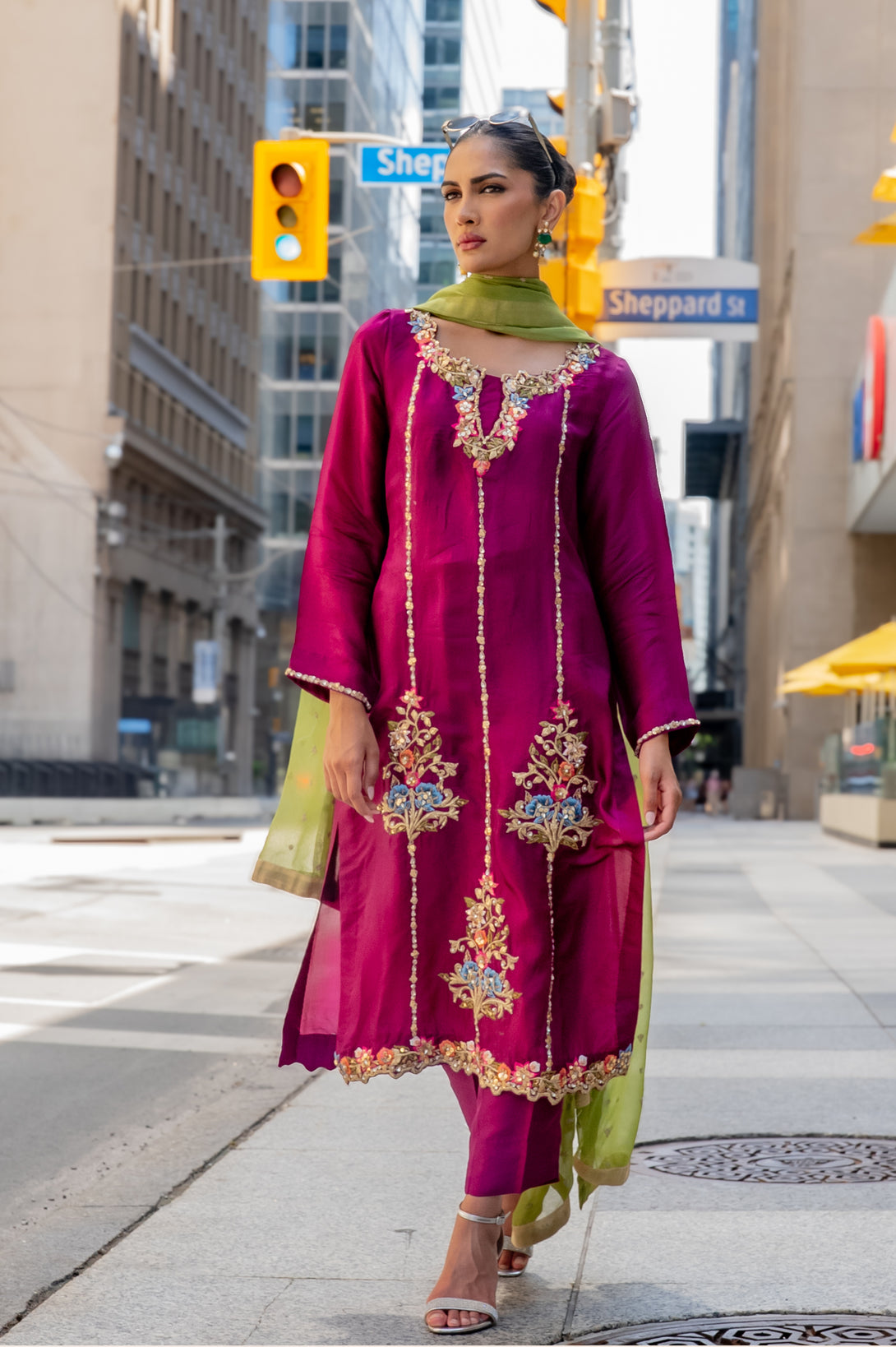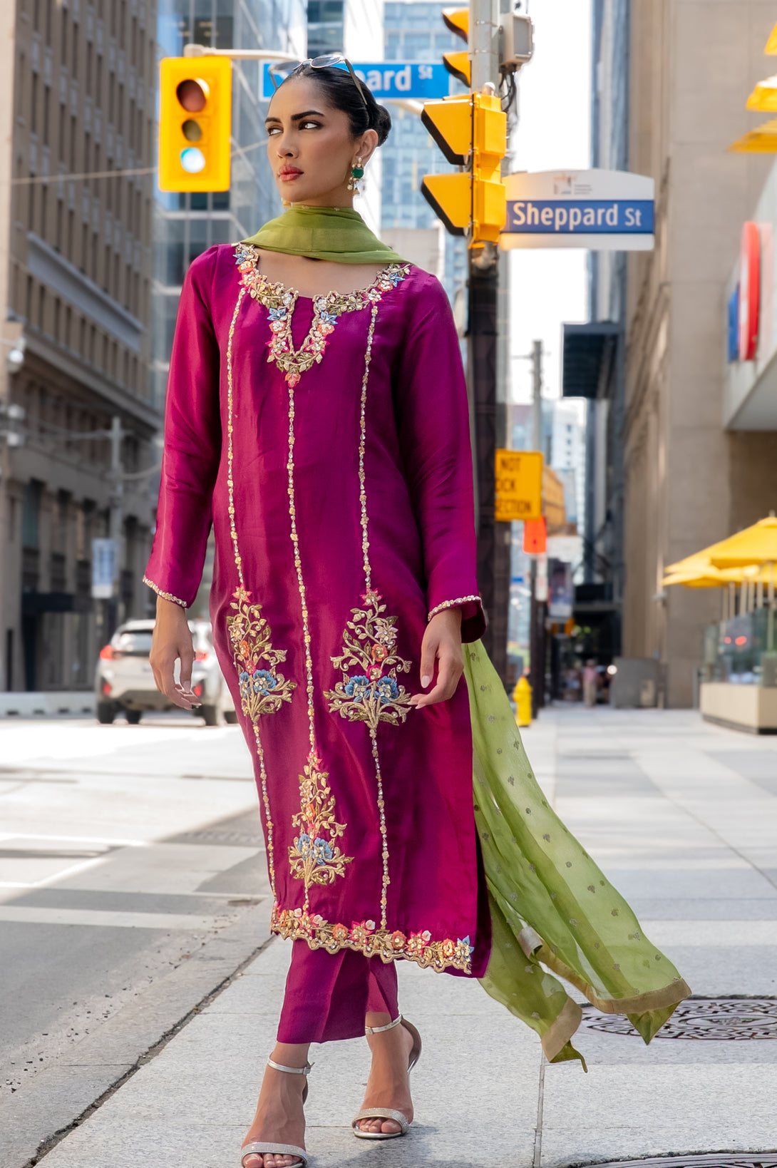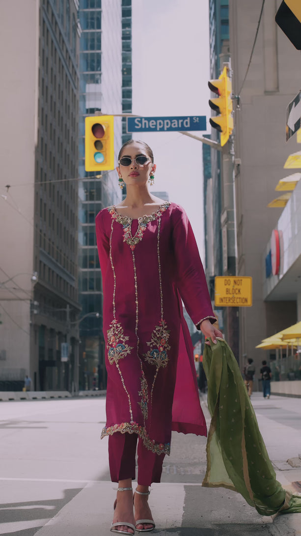 Paired with sleek straight pants, the ensemble reflects a graceful yet contemporary aesthetic. To complete the look, a contrast chiffon dupatta adds a striking touch, offering a soft drape with a vibrant play of colors that elevate the overall outfit.