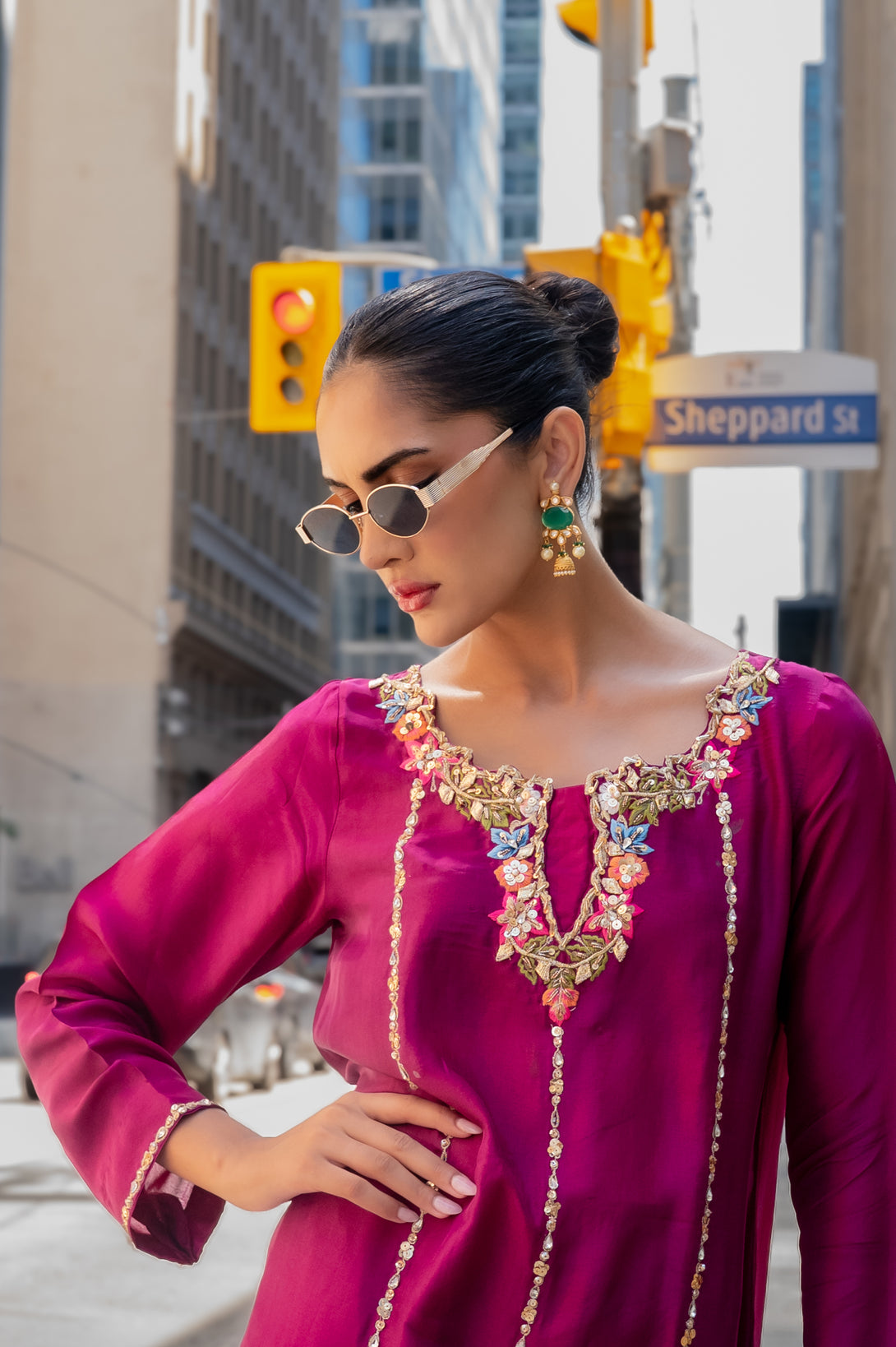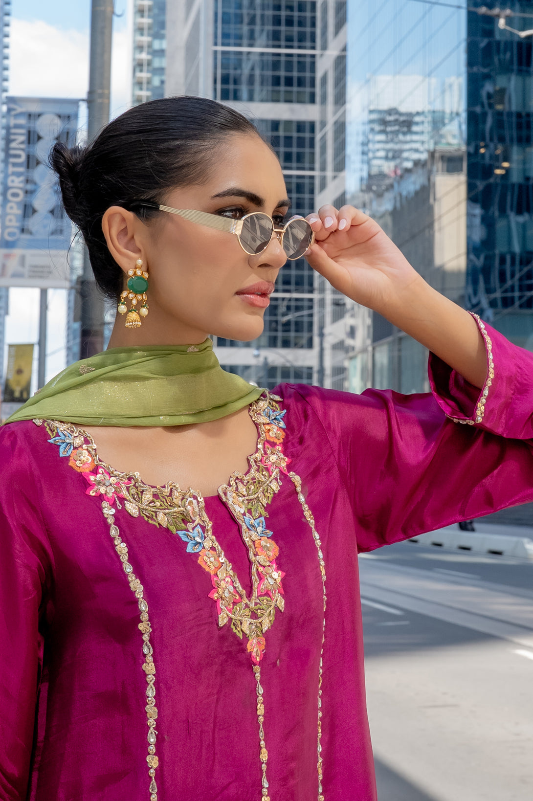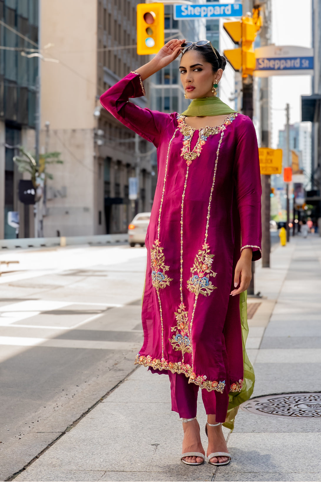 Paired with sleek straight pants, the ensemble reflects a graceful yet contemporary aesthetic. To complete the look, a contrast chiffon dupatta adds a striking touch, offering a soft drape with a vibrant play of colors that elevate the overall outfit.
