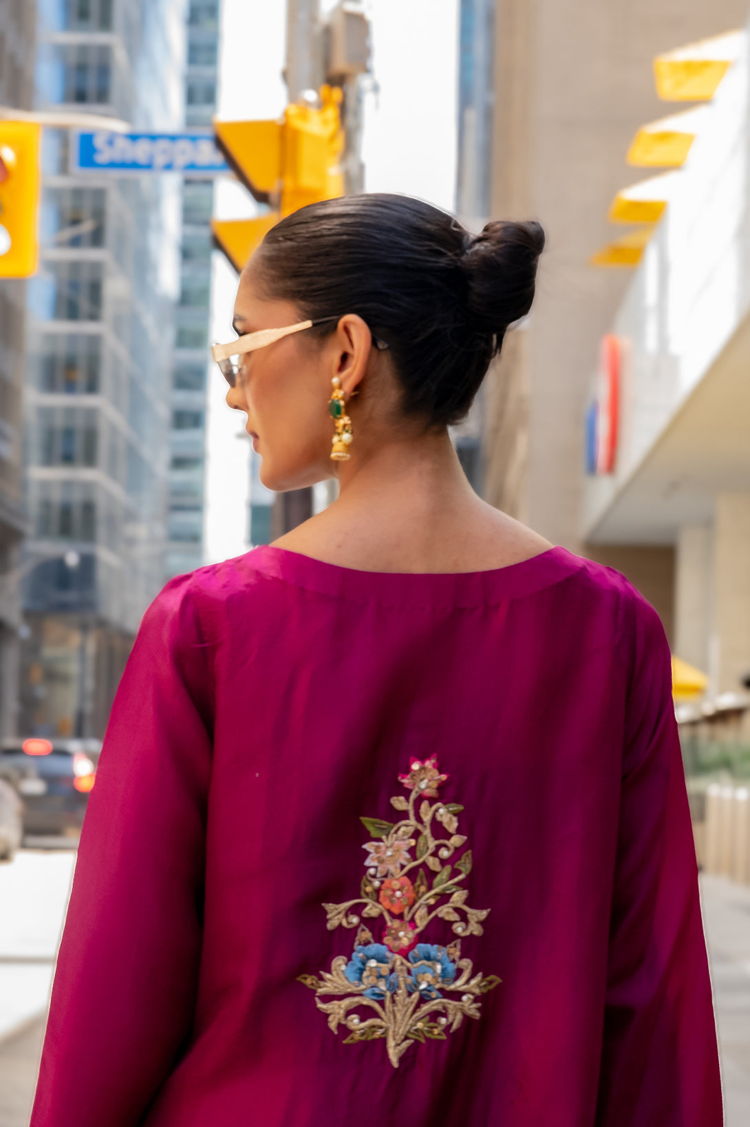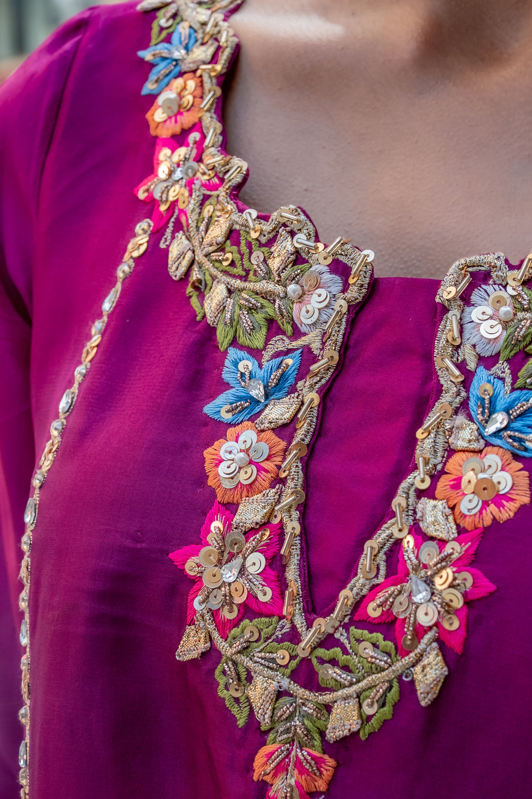 Radiating charm and sophistication, Azella is crafted on pure silk in a straight long silhouette that embodies elegance. The shirt is beautifully adorned with resham embroidery, complemented by intricate tilla and sitara handwork, creating a harmonious blend of texture and shimmer.
