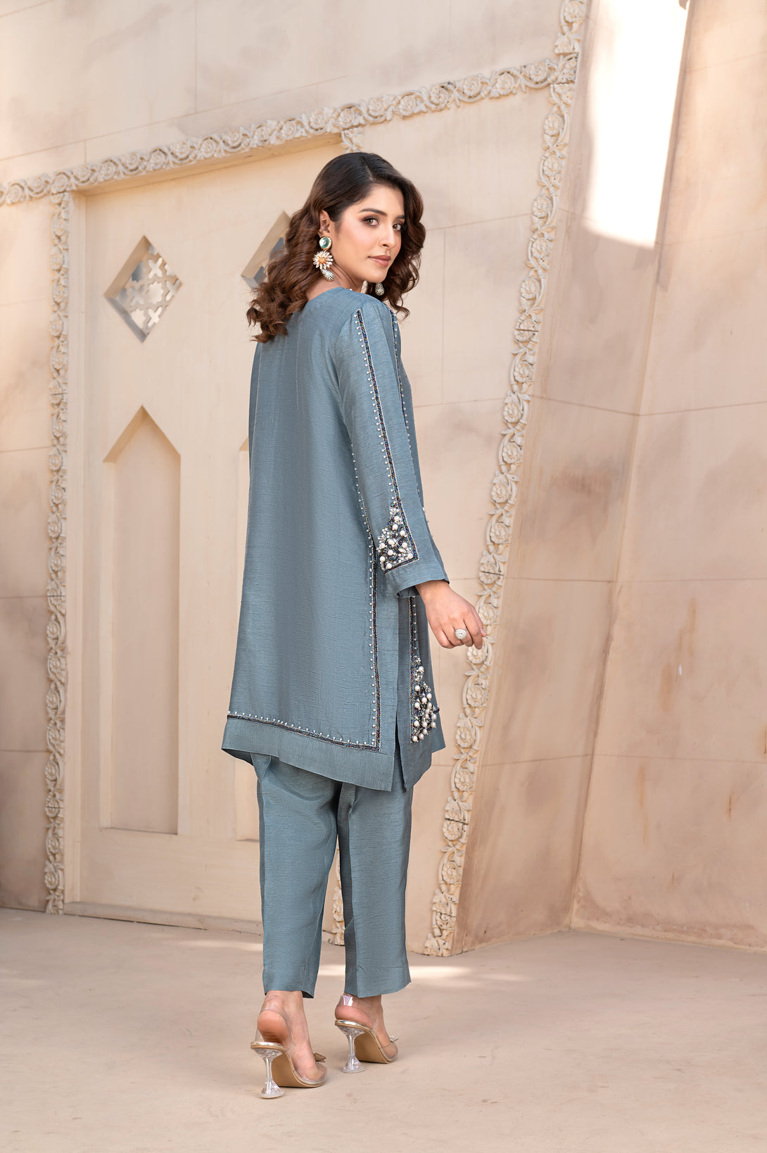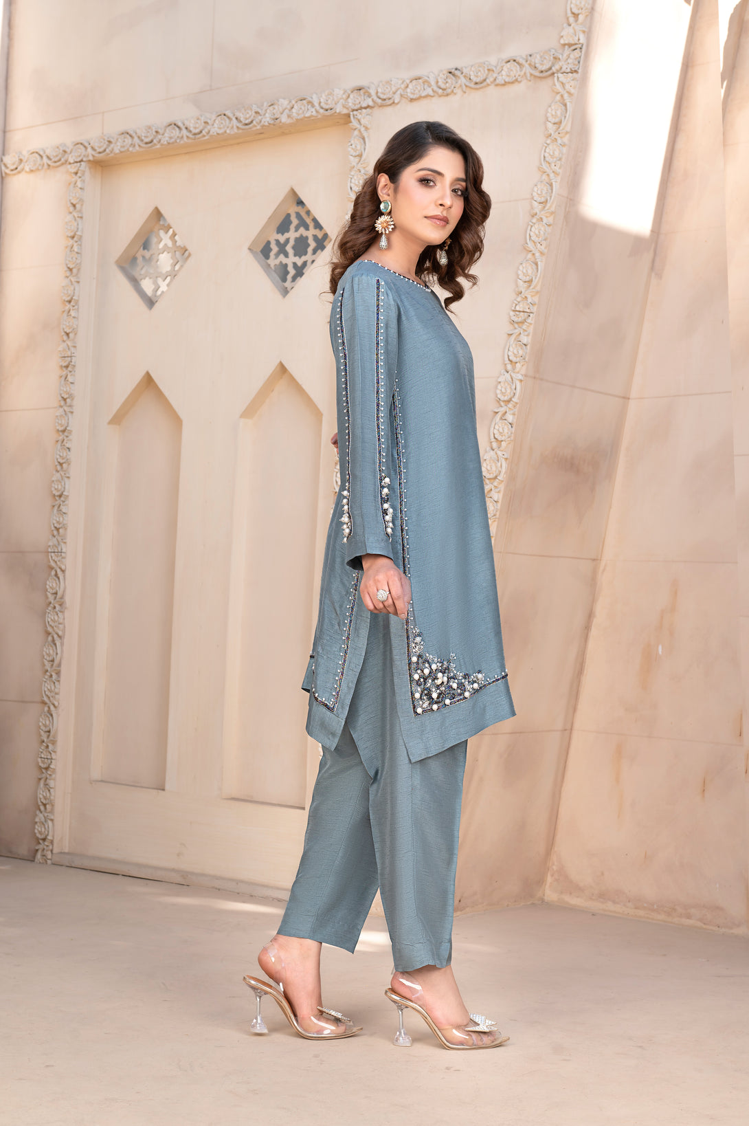 A masterpiece of delicate craftsmanship, Inaaya is a raw silk shirt beautifully detailed with handwork of cut dana and pearls on the sleeves, daman, and sides of the shirt, adding a subtle shimmer with every movement. The meticulous embellishments highlight the timeless charm of this elegant silhouette.
