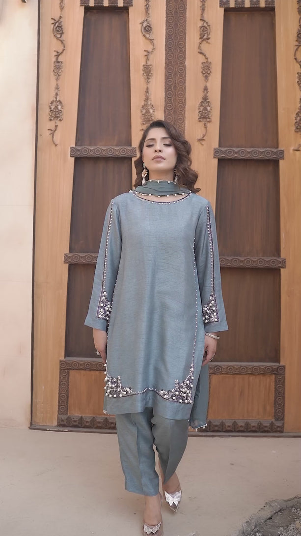 It is paired with classic straight pants for a graceful finish. To complete the look, a soft chiffon dupatta is edged with an elegant pearl lace all around, enhancing its refined and luxurious appeal.
