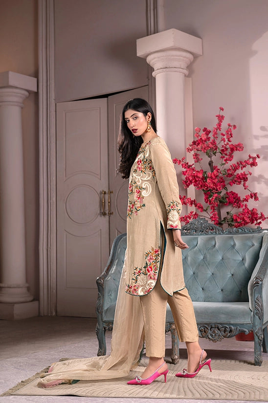 Embrace elegance with this chic ensemble, featuring a skin raw silk short shirt adorned with a beautiful multi-shade floral pattern on the front. It is perfectly paired with straight raw silk trousers creating a sleek and refined silhoutte. Completing this look with an organza dupatta featuring colourful lace detailing on all four sides, adding a touch of vibrancy and charm. It’s a ensemble that exudes sophistication and style.
