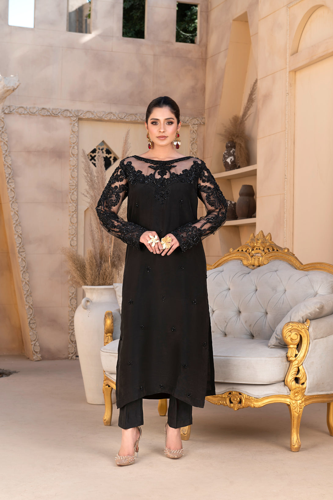 An ode to refined elegance, Inayat is crafted from luxurious silk and elevated with intricate detailing. The shirt is adorned with handwork of cut dana on lace across the shoulders and neckline, while the lace sleeves are further enhanced with delicate hand embellishments, adding subtle sparkle and artistry.