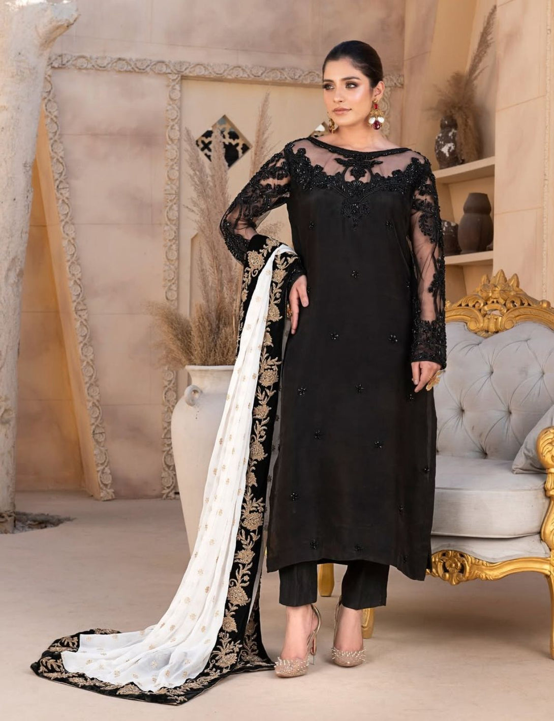 The ensemble is paired with sleek straight pants, keeping the silhouette graceful and timeless. Completing the look is a flowing chiffon boti dupatta, edged with a velvet border all around, exquisitely finished with copper aari embroidery for a regal touch.