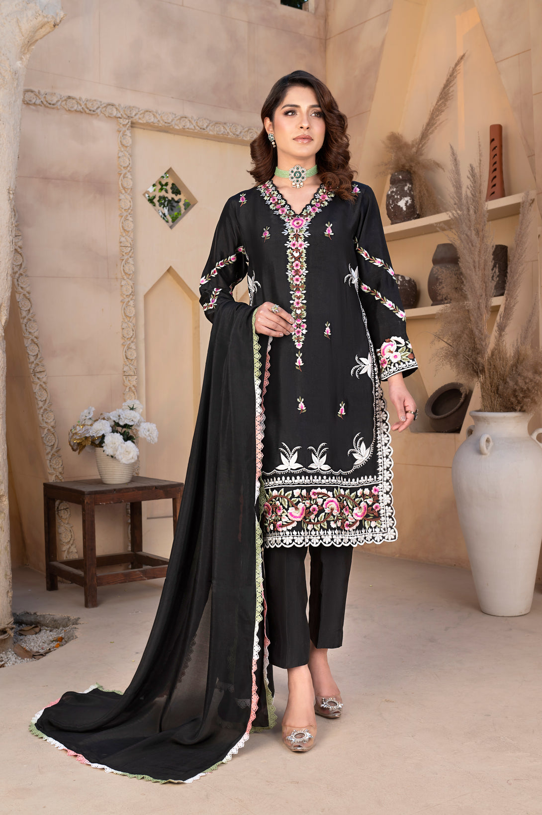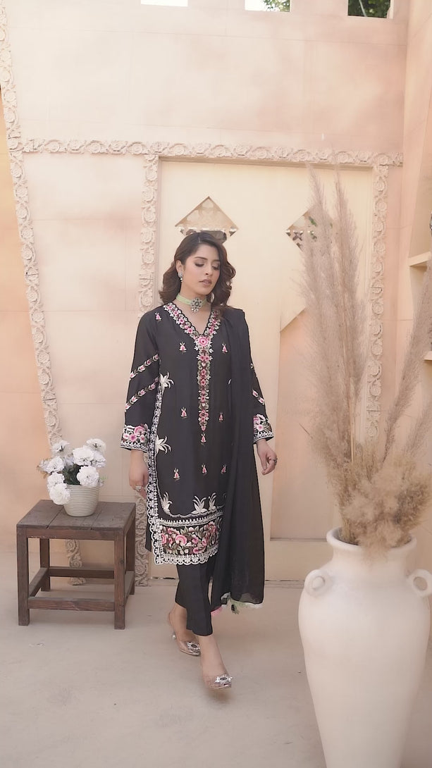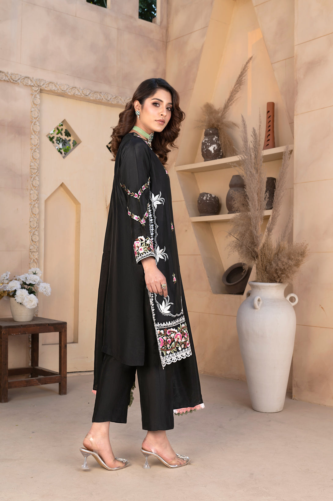 Izel is a striking ensemble in black silk, elevated with delicate pastel and white embroidery all over the shirt, creating a graceful contrast that blends elegance with subtle vibrance. The intricate threadwork highlights the richness of the fabric while keeping the design timeless.