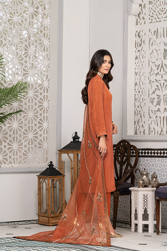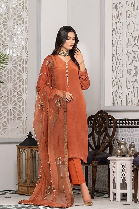 A glorious ochre canvas is set off in ’Mah e rosh’ featuring raw silk suit. Complimented by our plush heavily hand work embellished Dupptta with artsy Suzani Pearls, Sitara and French Knot details beautifully adorned with Ayesha Kiran’s quintessential artisanal handwork art and jamawar finishing in dupatta and suit, this design defines true flamboyance and an easy elegance which makes this the perfect look for any time of the day.
