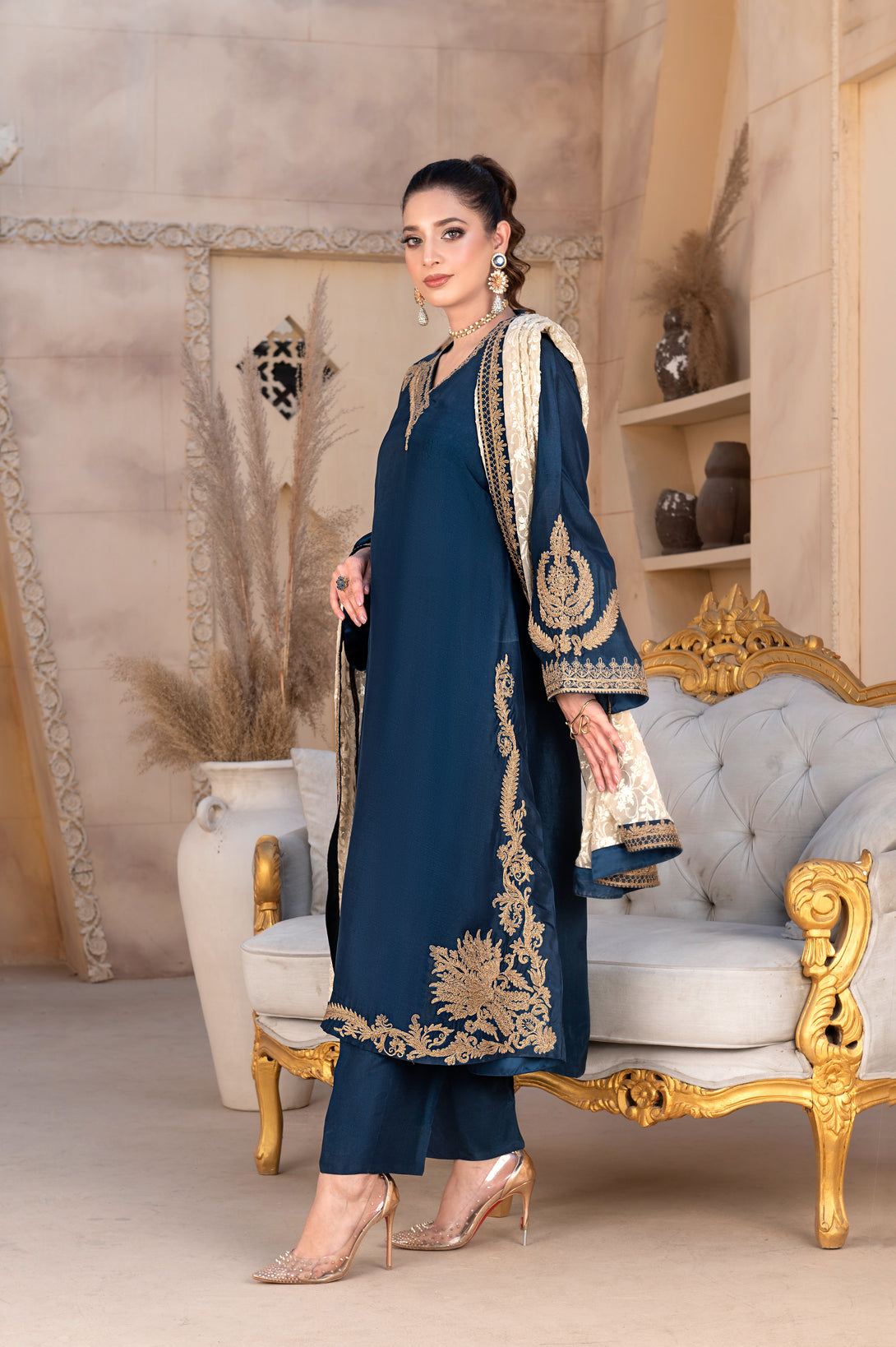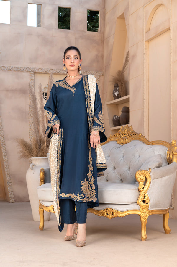 It is paired with sleek straight silk pants, keeping the look refined and balanced. Completing the ensemble is a dreamy chiffon dupatta, embellished with embroidery and sitara work, finished with a heavy copper embroidered border all around, creating an aura of grandeur and sophistication.