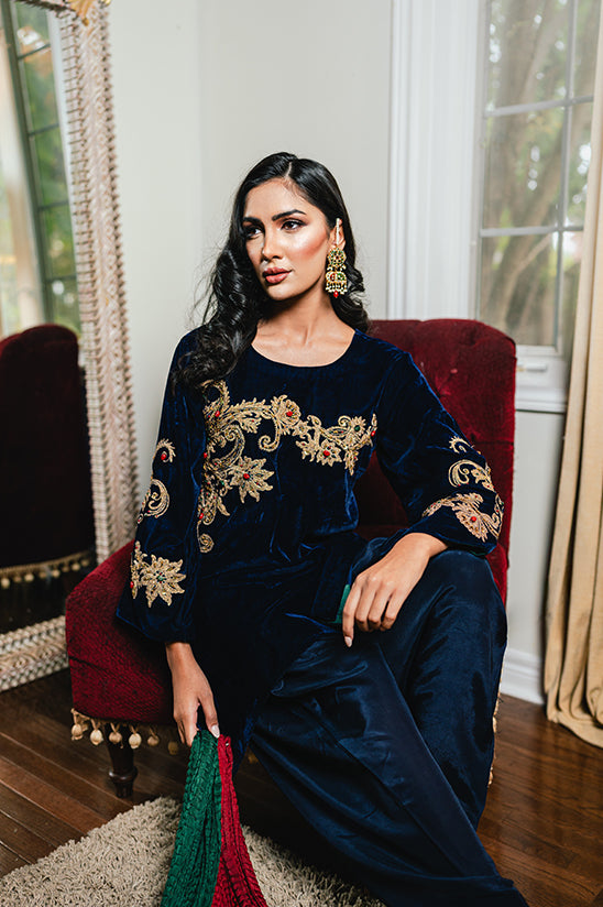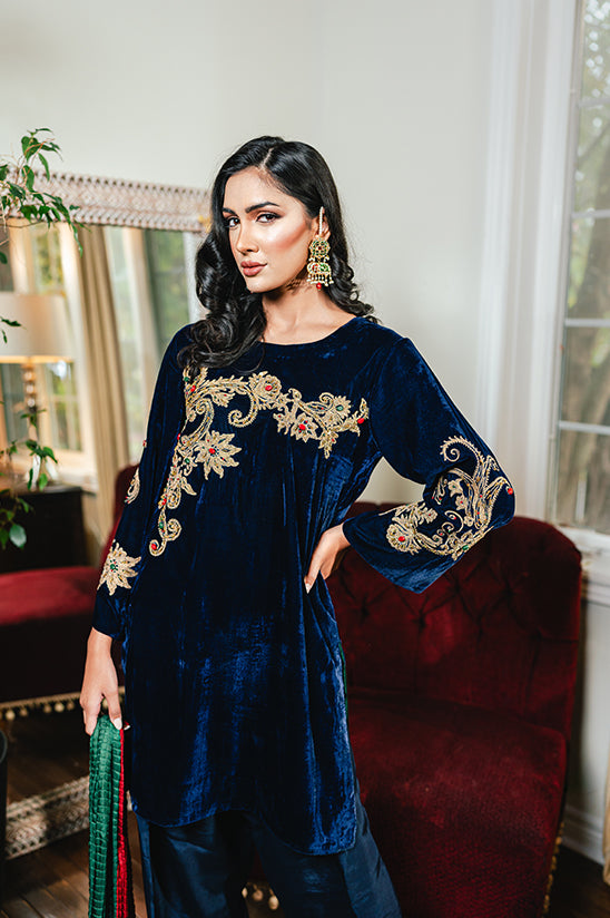Graceful and captivating, Renisa Blue is a masterwork of timeless elegance. The straight shirt is intricately adorned with handwork of doori, tilla, sitara, and stones, creating a luminous interplay of texture and shine. Paired with a traditional shalwar, the silhouette exudes classic charm with a refined finish.