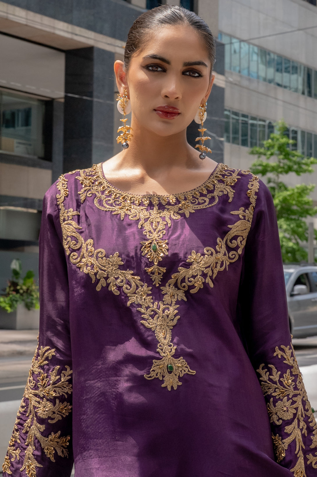 Step into timeless elegance with Riwayat, a classic ensemble that beautifully blends tradition with sophistication. Crafted on pure silk, the straight-cut shirt and trouser exude a graceful silhouette, making it a perfect choice for both festive and formal occasions.
