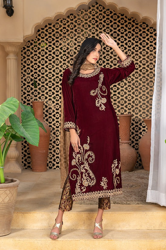 A straight Velvet Dark Maroon Shirt, incorporated with captivating golden Tilla, Dori and Dabka handwork, further enhanced by dainty patches around neckline, sleeves and Daman, paired up with A customary Jamawar Trouser combining Copper and Maroon tones, and a shimmery copper colored Crush Silk Dupatta
