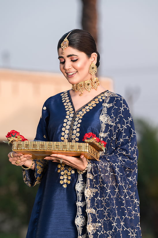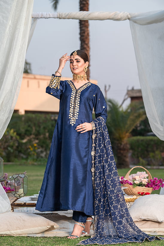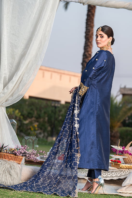 A dreamy Raw Silk landscape with great fitness This Royal Blue canvas is accented with copper Gold Panni Gotta Hand Work with Kaliyan and Jamawar Facing. This richly embroidered design is paired with an exquisitely elaborate Chiffon Dupptta with Copper Gold embroidery and Sitara. This masterpiece will stand out in every formal and festive gathering.