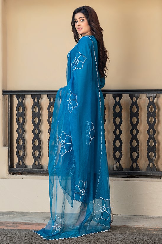 A beautifully flattering design “ Tabeer” is crafted from sumptuous raw silk adorned with a stylish neckline barouche and paired with an ornamental organza dupatta cinched with sitara work all over it . This barouche bejeweled dress is ideal for the fresco affairs and soirees.