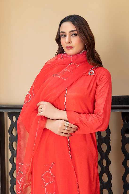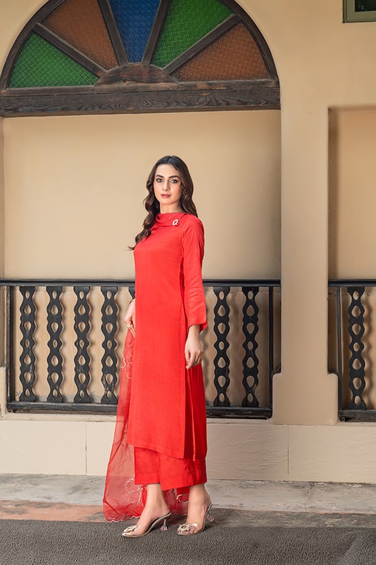 A beautifully flattering design “ Tabeer” is crafted from sumptuous raw silk adorned with a stylish neckline barouche and paired with an ornamental organza dupatta cinched with sitara work all over it . This barouche bejeweled dress is ideal for the fresco affairs and soirees.