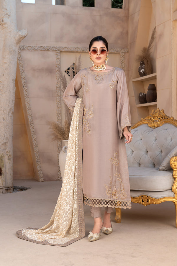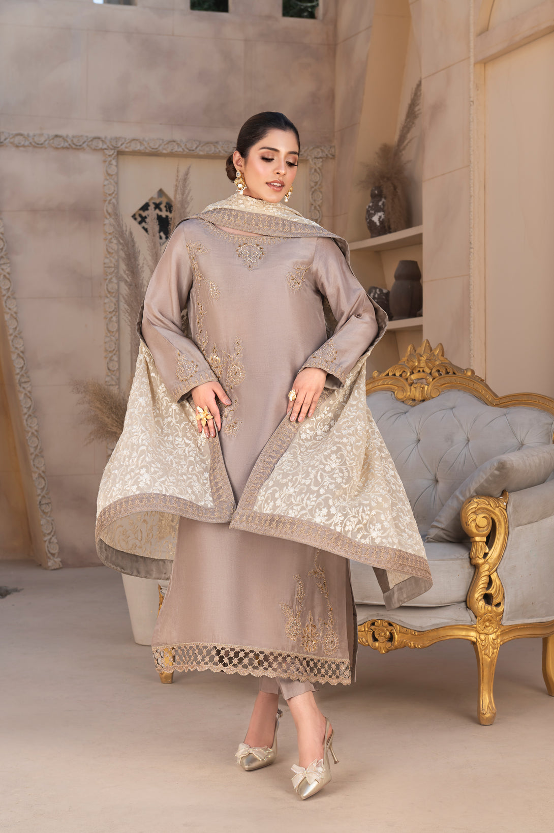 It is paired with elegant straight silk pants for a polished and balanced look. Completing the outfit is a stunning chiffon dupatta, fully embroidered and finished with a heavy border on all sides, adding depth, richness, and grandeur to the ensemble.